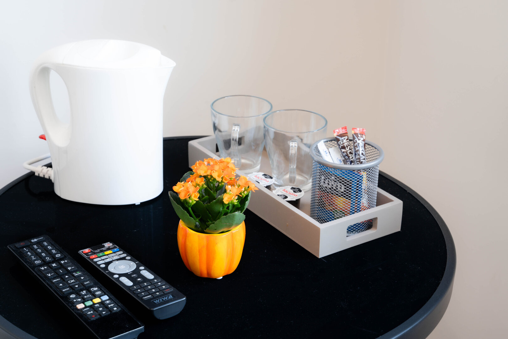 - stoliki z lampkami nocnymi i przedłużaczami do ładowania telefonów